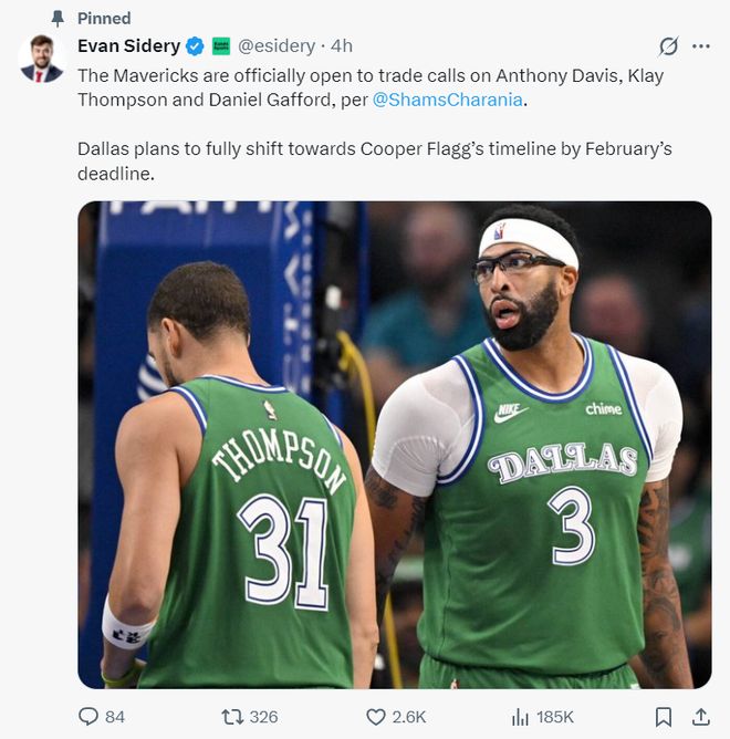 北京时间12月19日,ESPN记者Shams透露,克莱-汤普森、丹尼尔-加福德、丹吉洛-拉塞尔、安东尼-戴维森已经确定被摆上货架。随后美记埃文-斯迪瑞继续透露,在交易截止日之前将以状元库珀-弗拉格进行重建,克莱、浓眉等人筹码的交易筹码。