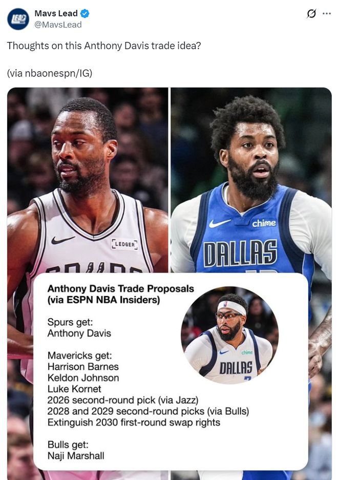 不过独行侠媒体认为马刺是有希望搅局的,因为戴维斯肯定更愿意留在西部,而且他也更愿意去马刺这样未来有夺冠前景的球队,模拟了这笔三方交易: